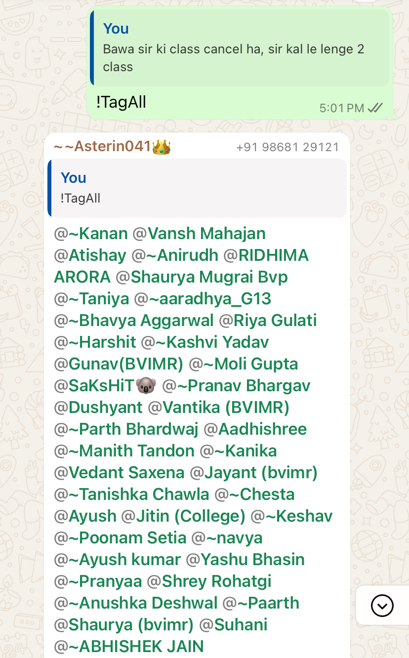 Asterin041 is a customized WhatsApp bot designed to enhance group interactions and automate tasks. The bot is capable of tagging all group members, reacting to specific phrases, and performing group spam based on user commands. This README provides details on how to use, contribute to, and extend the bot.