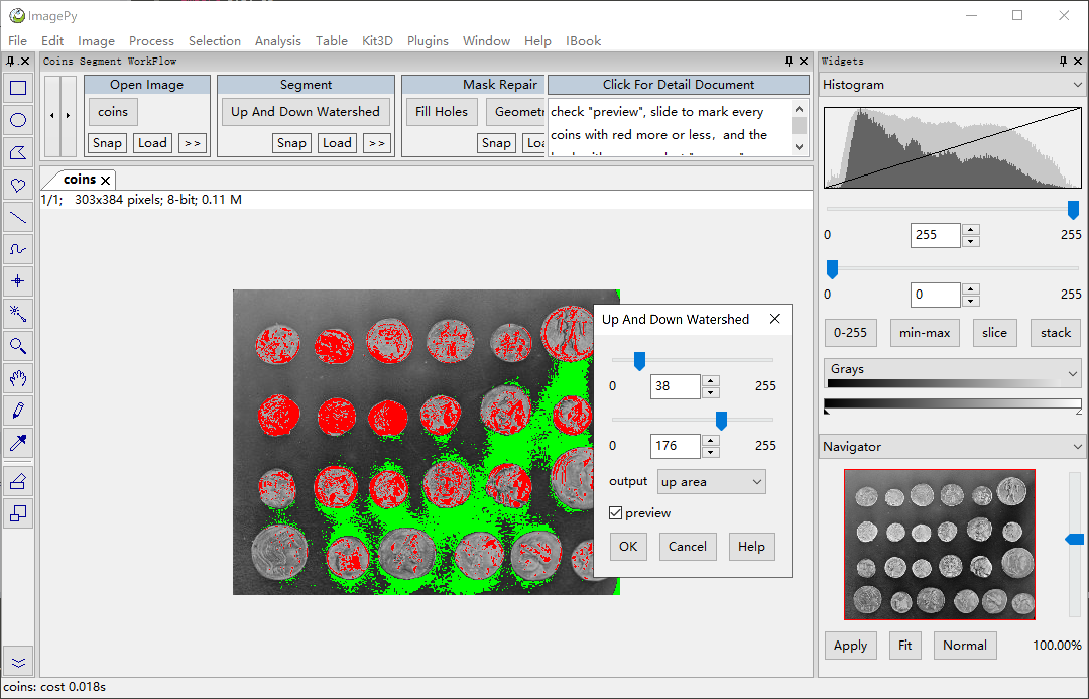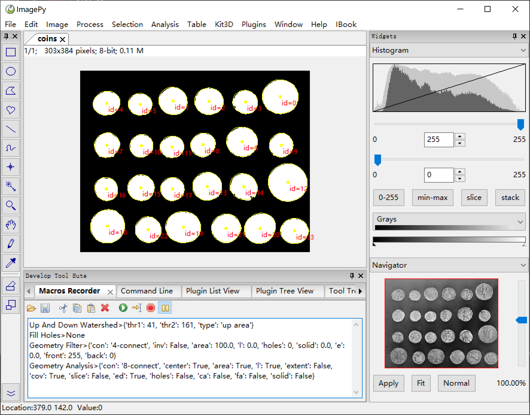 ImagePy has a very rich set of features, and here, we use a specific example to show you a glimpse of the capacity of ImagePy. We choose the official coin split of scikit-image, since this example is simple and comprehensive.