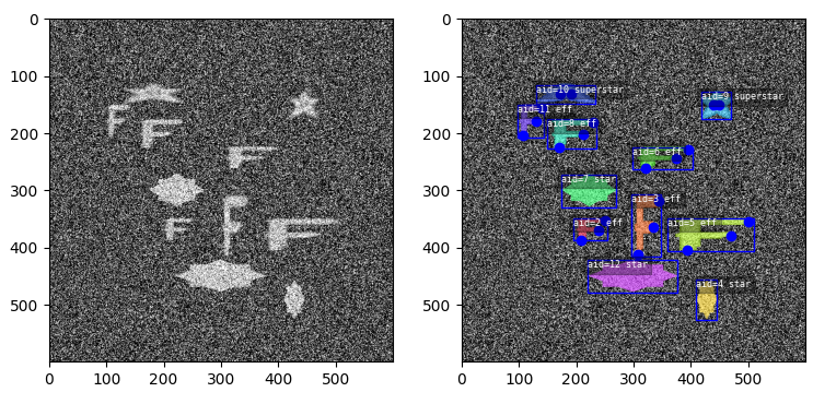 The toydata submodule renders simple objects on a noisy background --- optionally with auxiliary channels --- and provides bounding boxes, segmentations, and keypoint annotations. The following example illustrates a generated toy image with and without overlaid annotations.