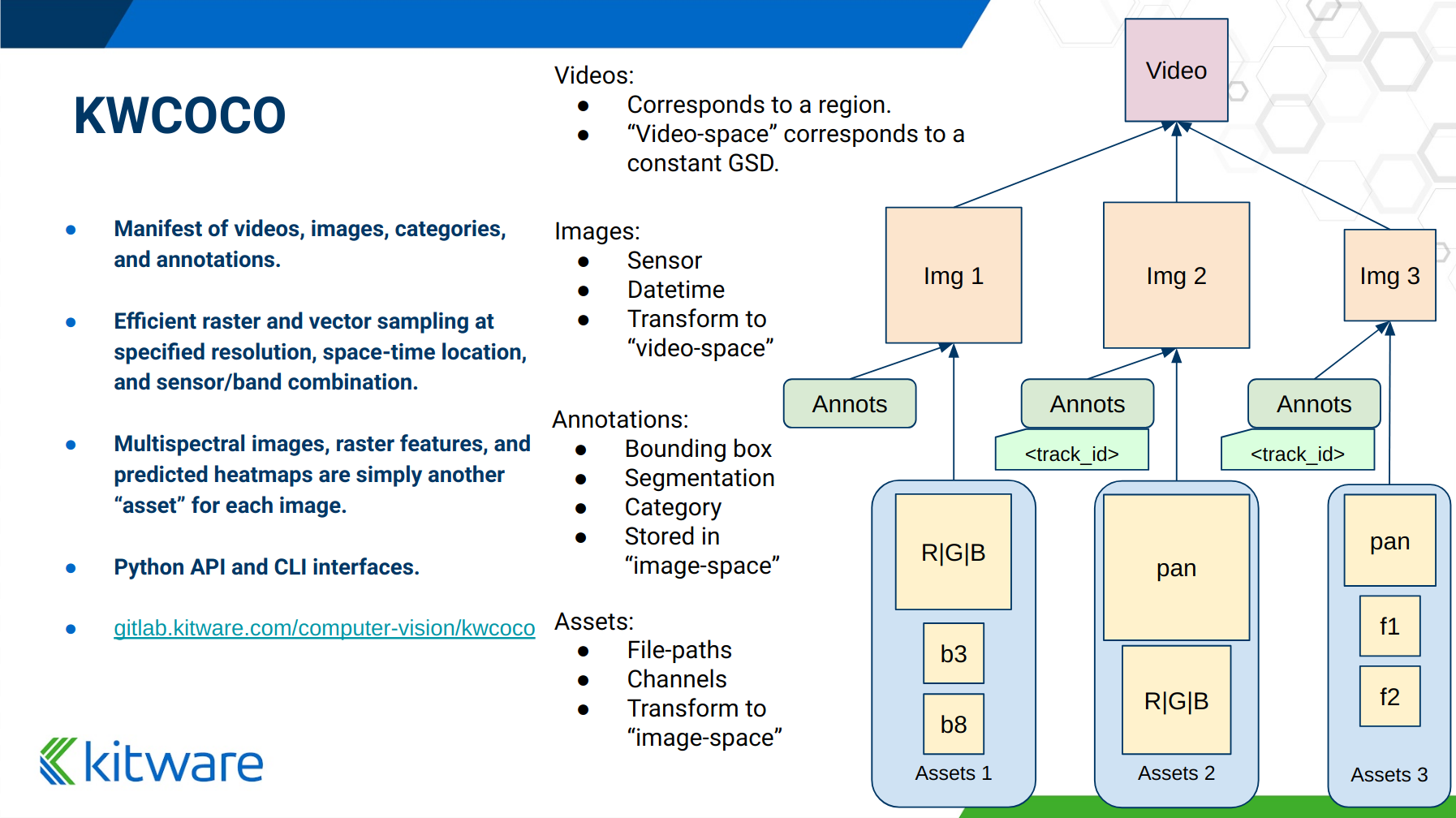 - KWCOCO can register many assets at different resolutions, register groups depicting the same scene at a particular time into an "image", and then groups of images can be grouped into "videos".