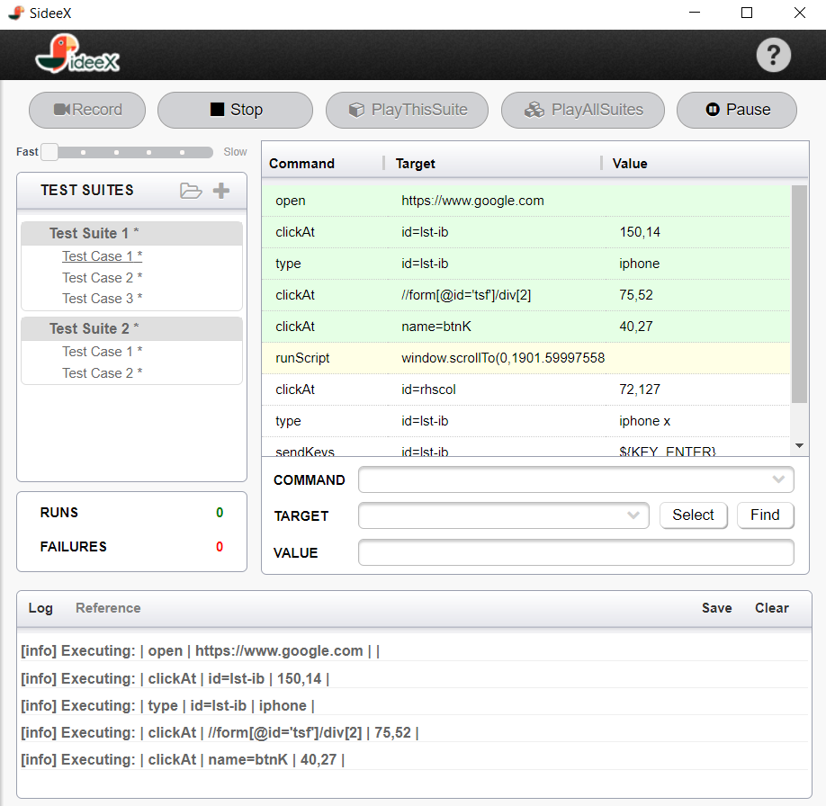 - SideeX 2.3 has been released. Support playback speed control bar, hot keys, loading old IDE test case files, breakpoint toggles, and In-APP references. Code is refactored and * number of bugs are fixed. (2017/10/26)