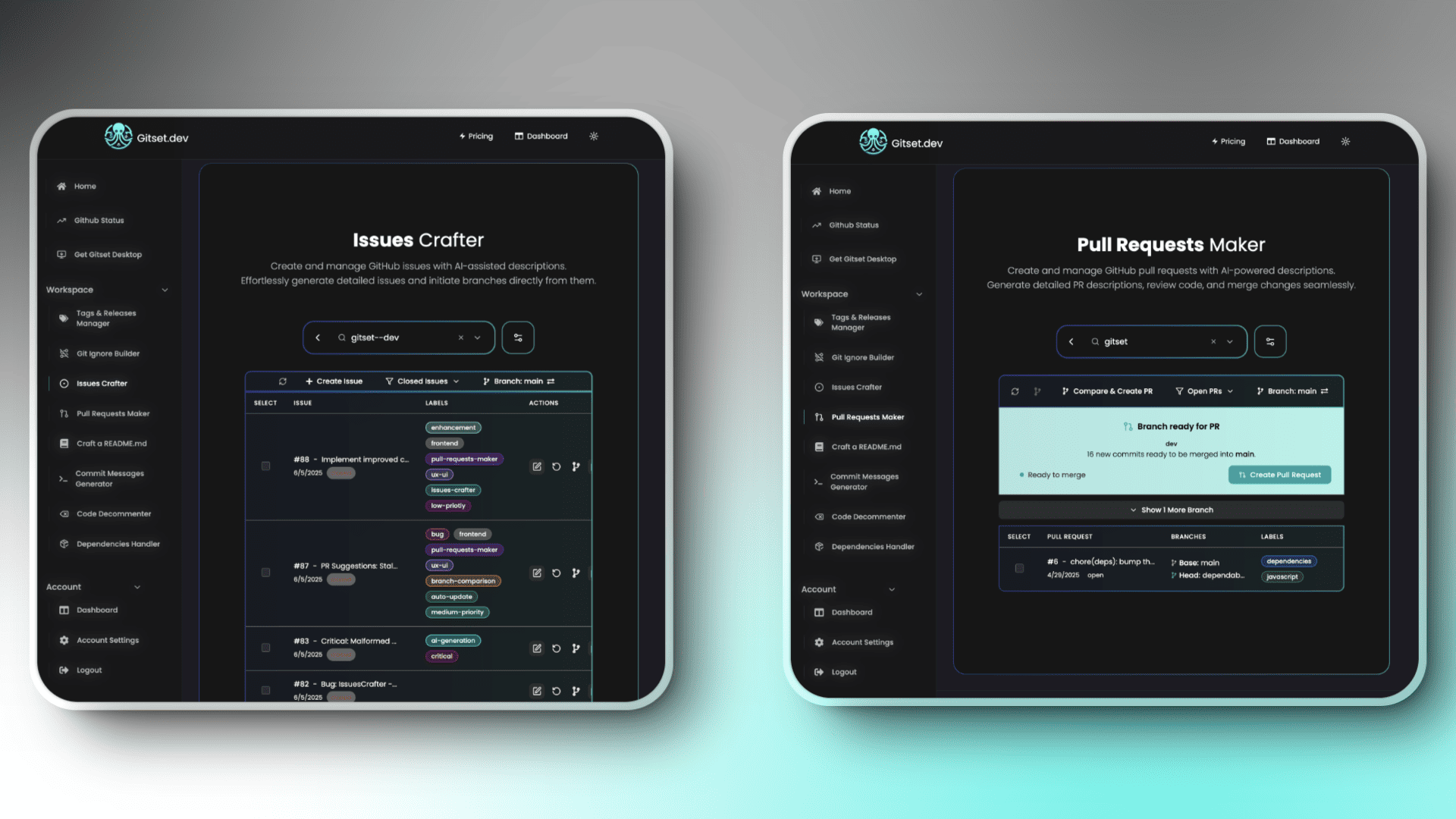 Gitset.dev is available as a desktop application for Windows, macOS, and Linux, providing the same powerful features as the web version in a convenient standalone format. The desktop application is built using Electron and follows the same versioning scheme as the web application. Updates to the desktop app are released concurrently with the web version to maintain feature parity across all platforms. Visit our download page to get the desktop application for your operating system.