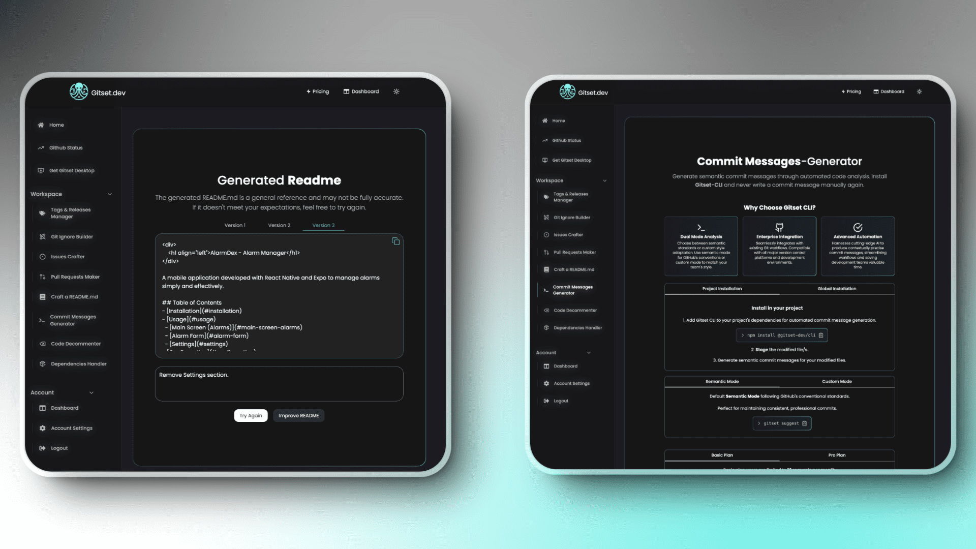 Gitset.dev provides a comprehensive web-based platform with 9 AI-powered tools accessible through your browser. These tools are organized into public utilities and authenticated services, all integrated with the token-based usage system.