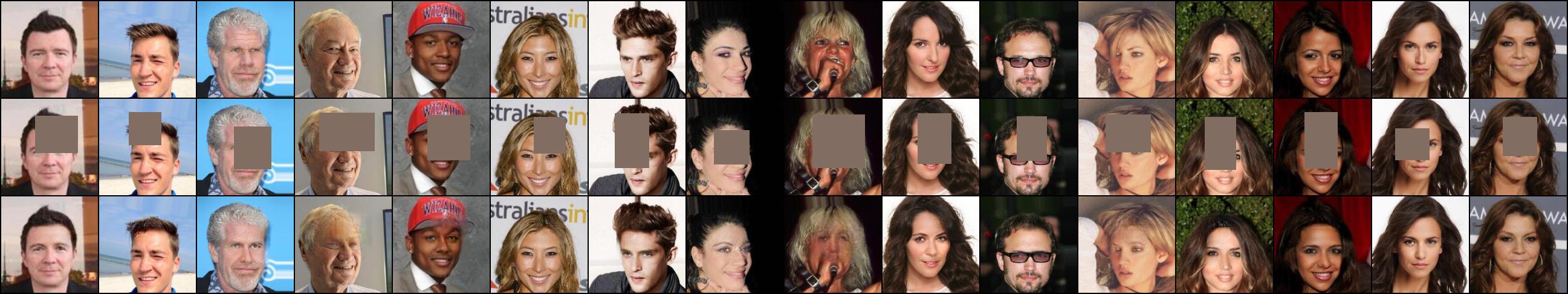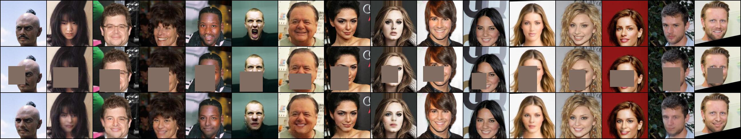 python train.py datasets/dataset/ results/result/ [--data_parallel (store true)] [--cn_input_size (int)] [--ld_input_size (int)] [--init_model_cn (str)] [--init_model_cd (str)] [--steps_1 (int)] [--steps_2 (int)] [--steps_3 (int)] [--snaperiod_1 (int)] [--snaperiod_2 (int)] [--snaperiod_3 (int)] [--bsize (int)] [--bdivs (int)]<dataset>(required): path to the dataset directory.<result>(required): path to the result directory.[--data_parallel (store true)]: when this flag is enabled, models are trained in data-parallel way. If N gpus are available, N gpus are used during training (default: disabled).[--cn_input_size (int)]: input size of generator (completion network). All input images are rescalled so that the minimum side is equal tocn_input_sizethen randomly cropped intocn_input_sizexcn_input_size(default: 160).[--ld_input_size (int)]: input size of local discriminator (default: 96). Input size of global discriminator is the same as[--cn_input_size].[--init_model_cn (str)]: path to a pretrained generator, used as its initial weights (default: None).[--init_model_cd (str)]: path to a pretrained discriminator, used as its initial weights (default: None).[--steps_1 (int)]: training steps during phase 1 (default: 90,000).[--steps_2 (int)]: training steps during phase 2 (default: 10,000).[--steps_3 (int)]: training steps during phase 3 (default: 400,000).[--snaperiod_1 (int)]: snapshot period during phase 1 (default: 10,000).[--snaperiod_2 (int)]: snapshot period during phase 2 (default: 2,000).[--snaperiod_3 (int)]: snapshot period during phase 3 (default: 10,000).[--max_holes (int)]: maximum number of holes randomly generated and applied to each input image (default: 1).[--hole_min_w (int)]: minimum width of a hole (default: 48).[--hole_max_w (int)]: maximum width of a hole (default: 96).[--hole_min_h (int)]: minimum height of a hole (default: 48).[--hole_max_h (int)]: maximum height of a hole (default: 96).[--bsize (int)]: batch size (default: 16). bsize >= 96 is strongly recommended.[--bdivs (int)]: divide a single training step of batch size = bsize into bdivs steps of batch size = bsize/bdivs, which produces the same training results as whenbdivs= 1 but uses smaller gpu memory space at the cost of speed. This option can be used together withdata_parallel(default: 1).